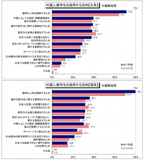 企業が外国人留学生を採用する理由として上のような理由が挙げられています。そして、企業が2018年度の採用見込みは2017年度の採用実績よりも増加していることから、企業は外国人雇用に満足しており、外国人を雇用する課題以上に外国人を採用するメリットが上回っているということが分かります。
