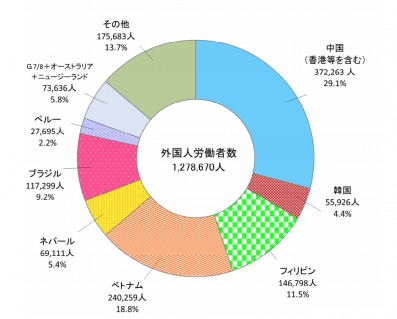 上のグラフから分かるように、外国人労働者は産業別に見ると製造業が一番多いと言えます。製造業に従事している国籍で多いのが、ブラジル、ペルー、フィリピン、ベトナム、中国で、韓国は卸売業、小売業が多いという結果がでています。また、G7の国で多いのは教育、学習支援業という結果になっており、国籍によって外国人の従事する産業が大きく異なっています。