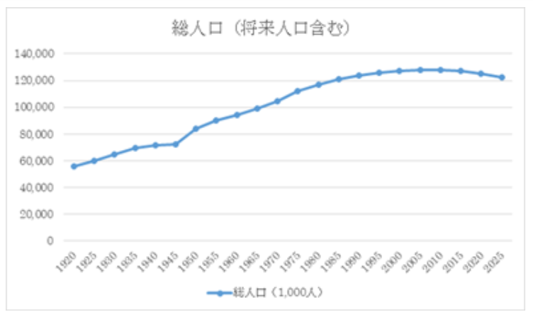 総務省統計局《人口の推移と将来人口》(平成29年)のデータによると、2025年までの総人口の変化は以下のようになります。