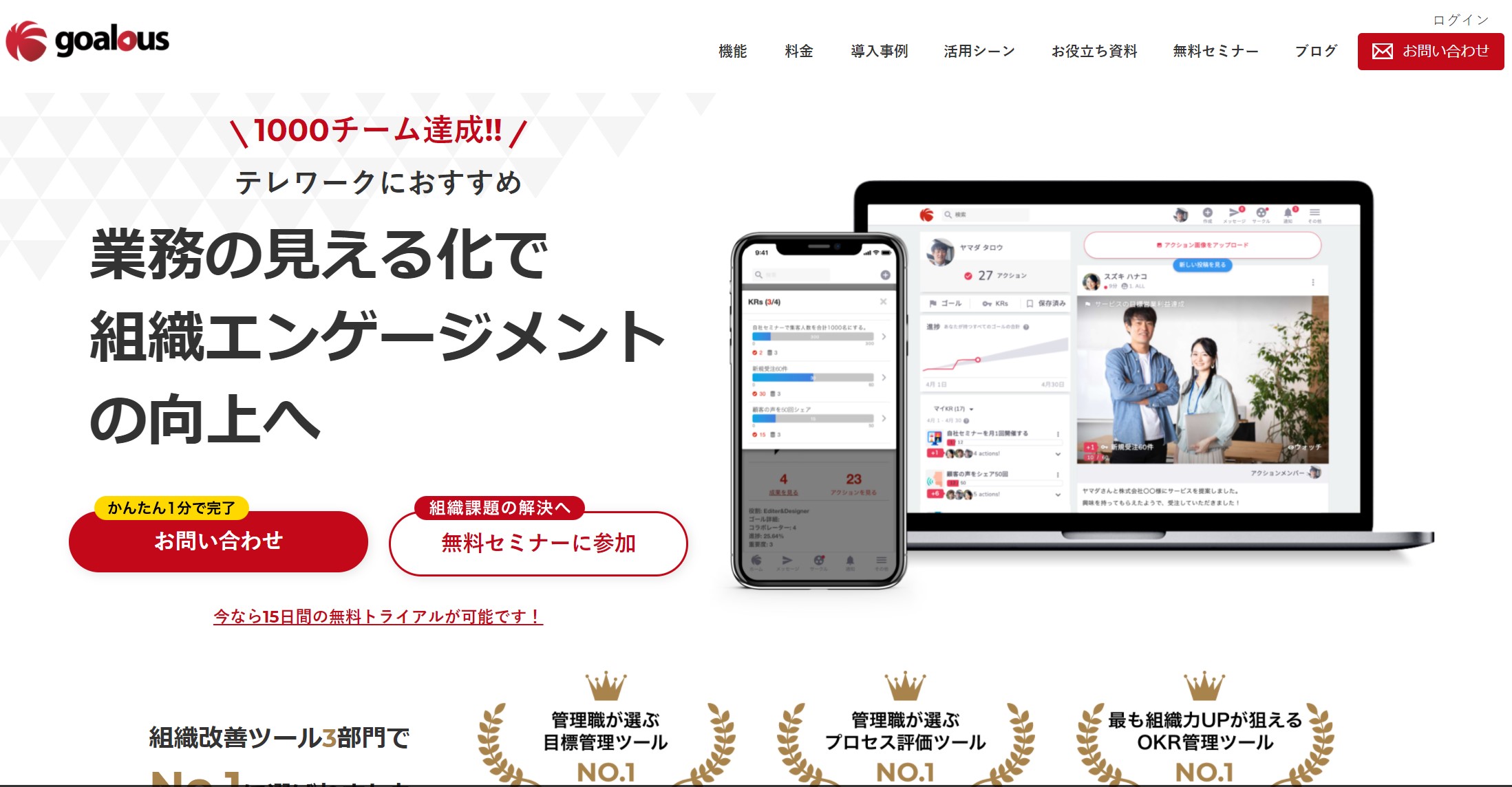 チャレンジ目標を管理するには、ツールを導入することも効果的かもしれません。Goalousは、チームのためのSNS型目標管理ツールです。「ゴール機能」を使えば、メンバーの目標や目標に向けた取り組みが確認できるので、状況や進捗の管理を行いやすくなります。また、社内SNSの機能もあるので、情報の共有を活性化することができます。自分の達成状況だけでなく、他の社員の目標や達成状況を見れるため、お互いに高め合うことも可能なのです。すでに富士フィルムイメージングシステムズ株式会社など1000以上のチームで導入されています。