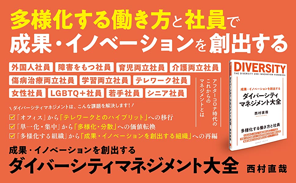 ここまでダイバーシティについて様々な角度から紹介してきました。しかしもっと詳しく知りたいという方もいるかもしれません。そのような方のために、一冊の本をご紹介します。本のタイトルは「成果・イノベーションを創出する ダイバーシティマネジメント大全」です。ダイバーシティマネジメントについて書かれた書籍はいくつかありますが、この本は社員のタイプをカテゴリー化し、大全という形でまとめています。興味を持った方は書店やインターネットなどで確認してみてください。