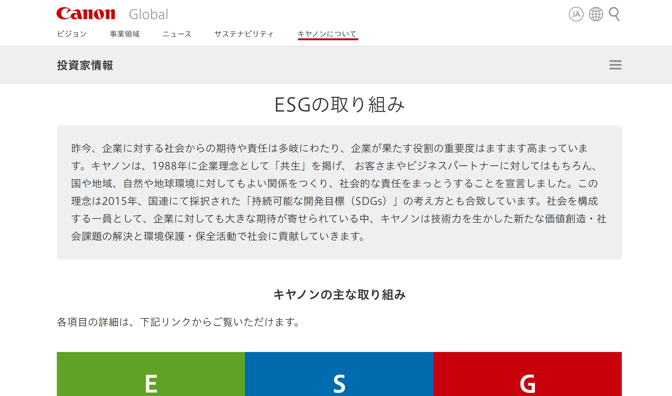 最後にESGに積極的に取り組む企業を3社紹介します。1社目はカメラやビデオなどの映像機器やプリンタ、複写機などの事務機器メーカーとして有名なキャノン株式会社です。キャノンは1988年に企業理念として「共生」を掲げ、国や地域、自然や地球環境に対しても良い関係を作り社会的責任を全うすることを宣言しました。そして自社の製品を通じて「新たな価値創造」、そして「社会課題」の解決を目指しています。