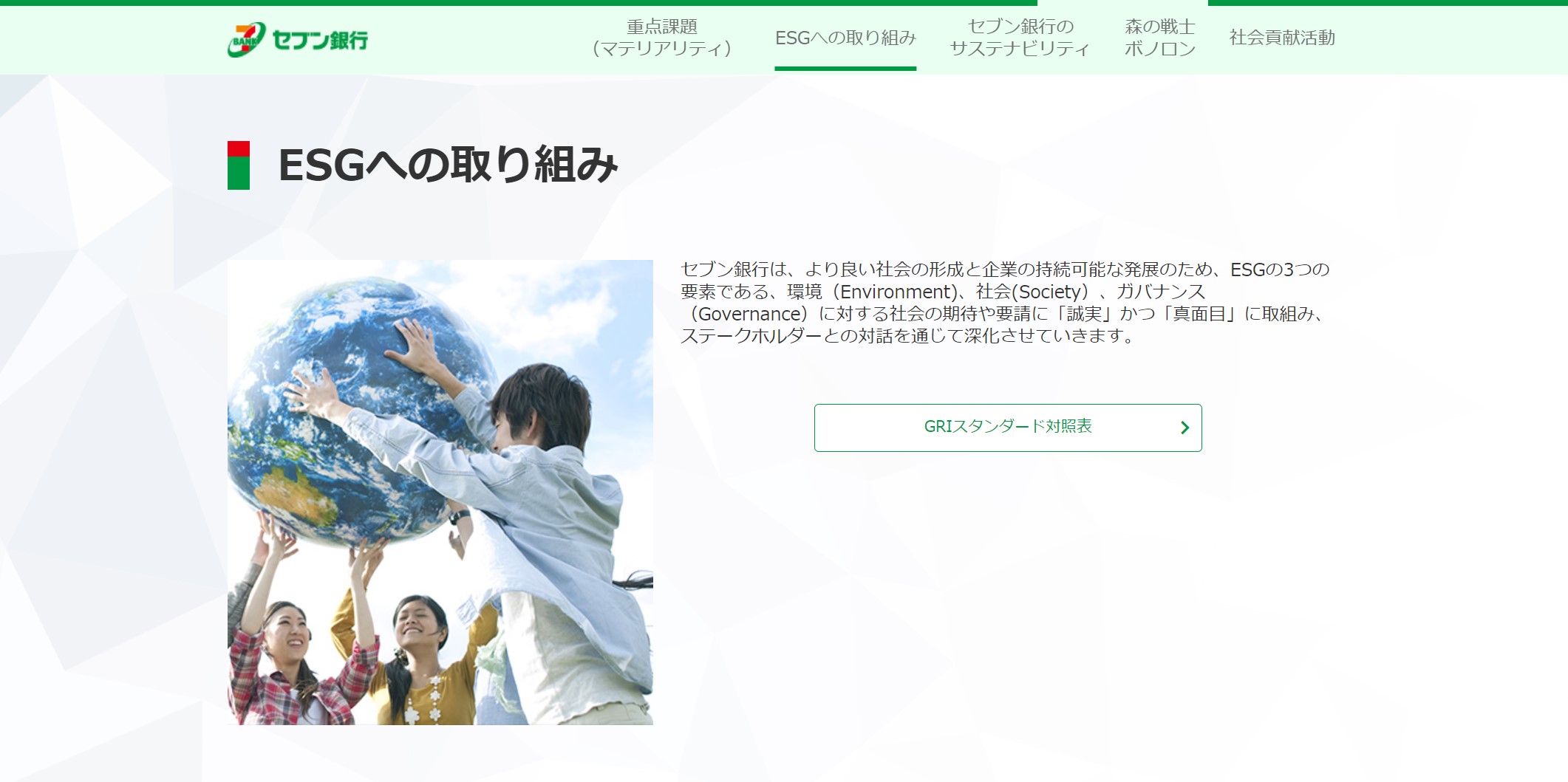 2社目はコンビニATM事業の最大手として有名な株式会社セブン銀行です。セブン銀行ではESGの3つの要素それぞれに対する独自の取り組みを行なっています。例えば環境面では、ATMの省電力化やサービスのペーパーレス化などを行ない、環境負荷の低減に取り組んでいます。他にも多様な人材が活躍出来るための職場を目指すために、女性の活躍に向けた行動計画の策定など、様々なアクションを起こしています。
