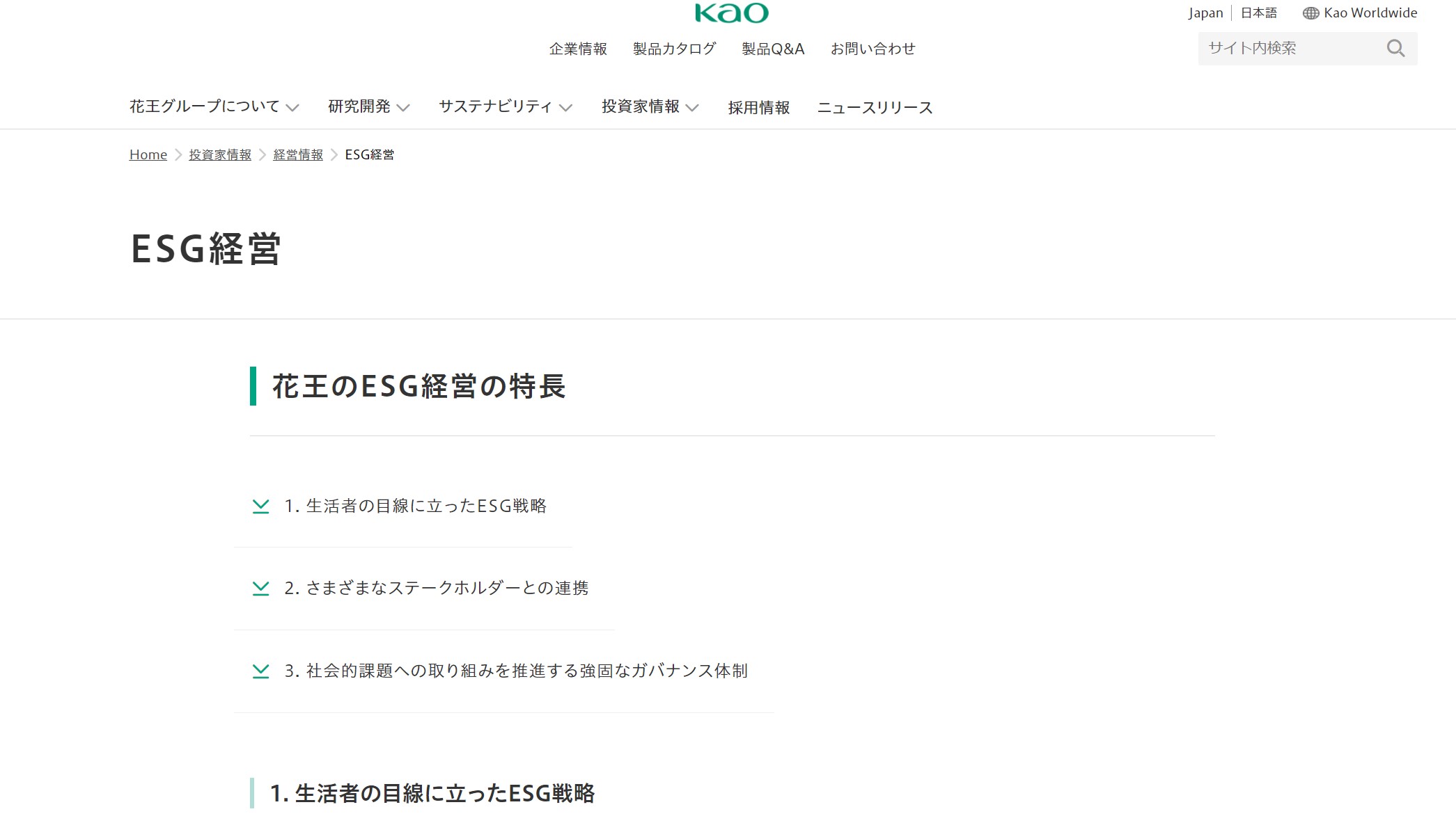3社目は、大手消費財メーカーである花王株式会社です。花王はESG経営を掲げていて、その特長を三つあげています。1つ目は生活者の目線に立ったESG戦略。2つ目はさまざまなステークホルダーとの連携。3つ目は社会的課題への取り組みを推進する強固なガバナンス体制です。特に3つ目のガバナンス体制に関しては、ESGコミッティ、ESG推進会議、ESGタスクフォースなどを設置し、柔軟なESG活動を実現させています。