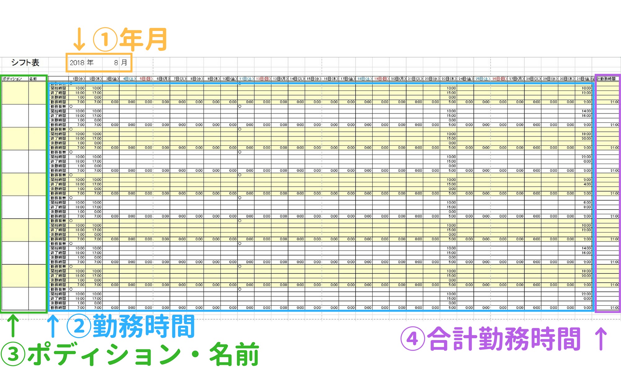 そのために、シフト表に含める情報は必要最小限に留めることも大切。従業員に必要なものは「誰」と「日付や曜日」と「勤務時間」です。