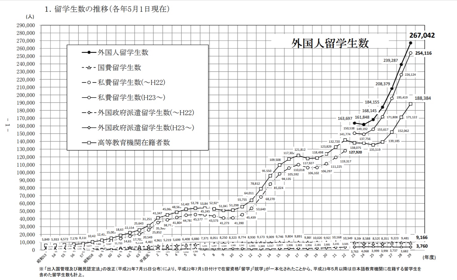 表から分かるように外国人留学生の人数は年々増加しています。現在の留学生の人数と10年前の留学生の人数を比較すると約2倍増加しています。これは政府が2020年までに留学生の人数を30万人まで増加させる施策「留学生30万人計画」を実施したためです。