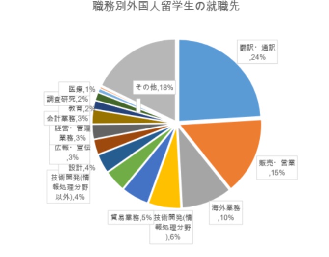 職務別で外国人留学生の就職先を見てみると翻訳・通訳での許可人数が最も多い結果となっています。バイリンガル人材はグローバル化を進める企業にとってはとても貴重な人材であるため納得できる結果でしょう。翻訳・通訳に次いで販売・営業、海外業務が多くなっています。これらの職務は海外とのやりとりがあるため、言語能力や異文化対応能力が長けている外国人が採用されていると考えられれます。