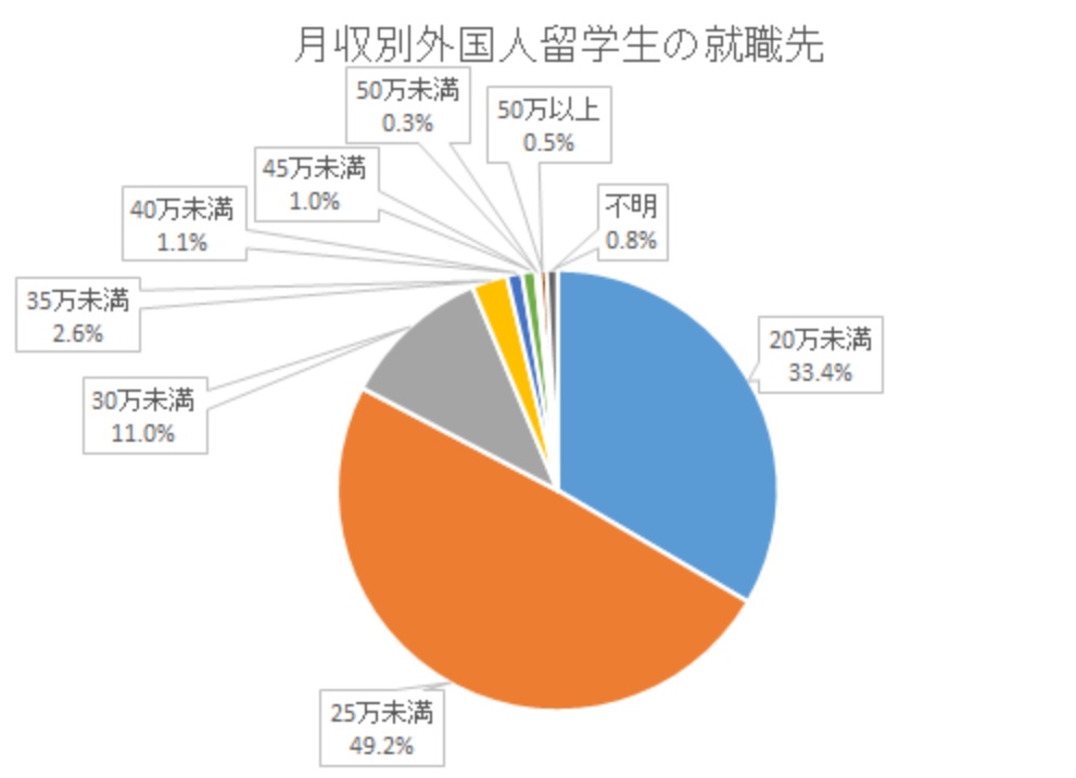 月収別に外国人留学生の就職先を見てみると20万円から25万円未満が半分を占めています。新卒採用される日本人学生の初任給の平均が約20万円です。この結果から留学生と日本人の報酬相場の差異はないということが言えます。
