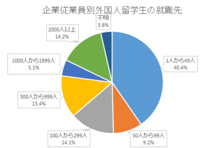 留学生の就職先で最も多い企業は、従業員数が50人未満の企業という結果になっています。また、従業員数が300人以下の企業に就職している留学生が過半数を占めています。この結果から、留学生は中小企業を好んでいるという傾向があると考えられます。