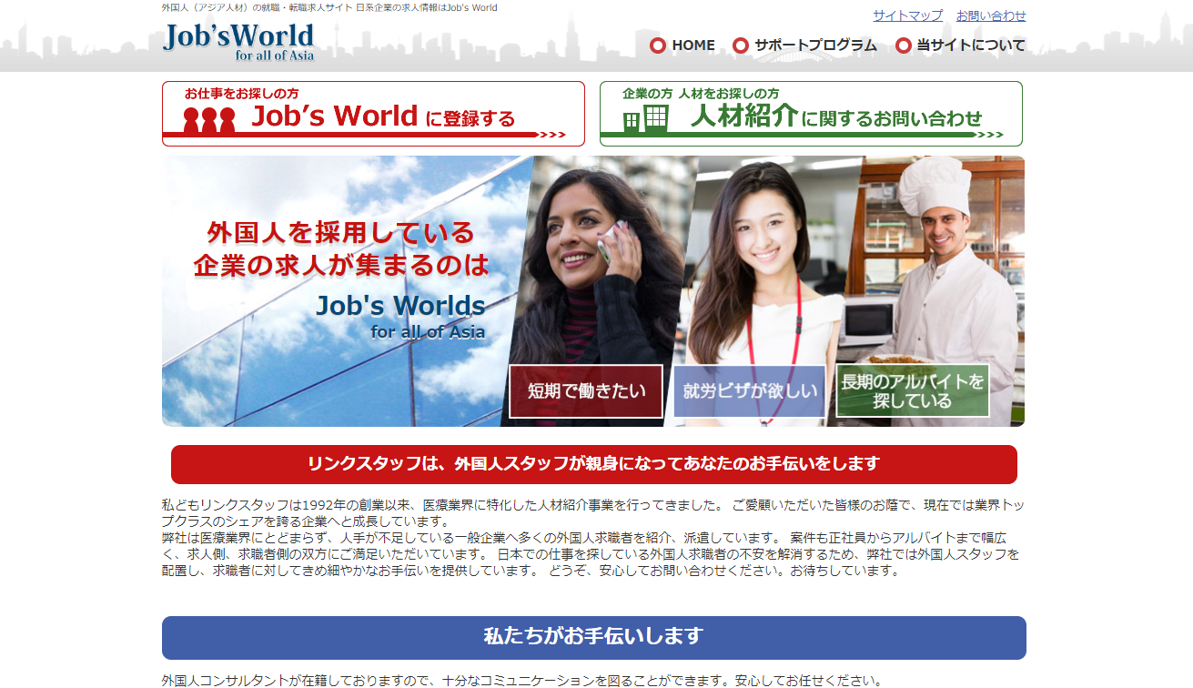 外国人派遣を行っている会社のおすすめの一つに、株式会社リンクスタッフもあります。株式会社リンクスタッフの特徴は手厚いサポート体制。雇用後の定着率を維持するためにも2ヶ月に一度の面談を行い、電話やメールでは随時相談することも可能です。短期間の雇用になることも多い派遣であっても雇用後のサポートを受けられる点は大きなメリットでしょう。また株式会社リンクスタッフは日本で初めて介護業界に外国人を紹介した会社。介護業界で外国人を雇用したいと思っている雇用主や、初めて外国人を雇用する企業にはおすすめの会社でしょう。