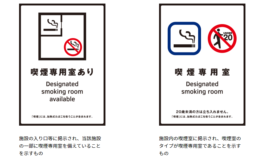 改正法では、屋内に喫煙可能な設備を持った施設に対し、指定された標識の掲示が義務付けられています。施設管理者は施設の出入口と喫煙室出入口の両方に、誰が見ても一目で分かるような標識を掲示することが義務となります。飲食店の場合は禁煙の場合でも掲示義務ですので、注意しましょう。標識デザイン例は厚生労働省ホームページなどで公開されており、誰でもダウンロードができるようになっていますが、このデザインは必要事項が記載されていれば独自で作成し掲示するのも問題はないようです。