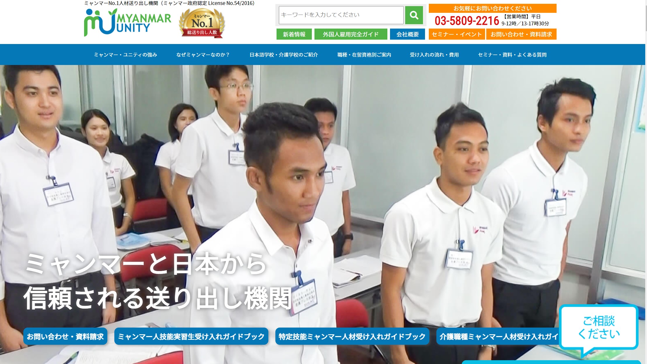 ミャンマー技能実習生を受け入れる際には、送り出し機関を利用しましょう。MYANMAR UNITYは、計1381名にものぼる実習生を日本に送り出しており、送り出し機関の中でNo.1の実績を誇っています。日本とミャンマーそれぞれに両国籍のスタッフが常駐しているため、 両国でのきめ細やかな対応、サポートが可能です。入国前の教育を徹底して行っており、日本語のレベルが高い技能実習生が多いのも特徴的です。