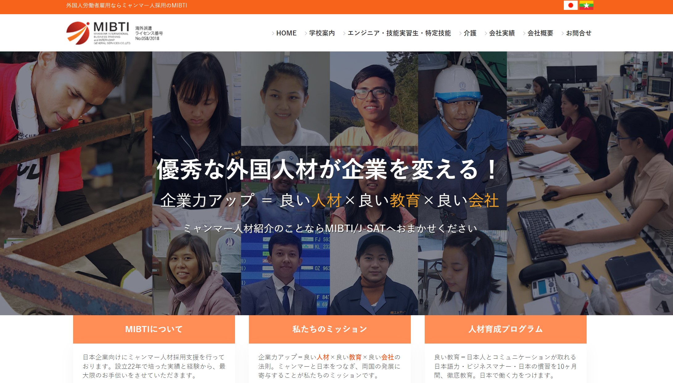 人材紹介会社を利用することも、ミャンマー技能実習生を受け入れる方法の1つです。MIBTIでは、550人以上のミャンマー技能実習生が約90社の日本企業に受け入れられ活躍しています。大学進学率8%の難関の中から、さらに20倍の入学倍率を乗り越えたJ-SATアカデミーを卒業した人材の紹介を行っています。MIBTIでは、レベルの高いミャンマー技能実習生を受け入れることができるでしょう。送り出し後も日本滞在のミャンマー人が受け入れ企業と派遣者を徹底フォローしてくれるので、初めてでも問題なく受け入れられます。