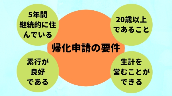 【帰化申請の要件】①日本に5年間継続的に住んでいる(うち3年間働いている)※アルバイト不可