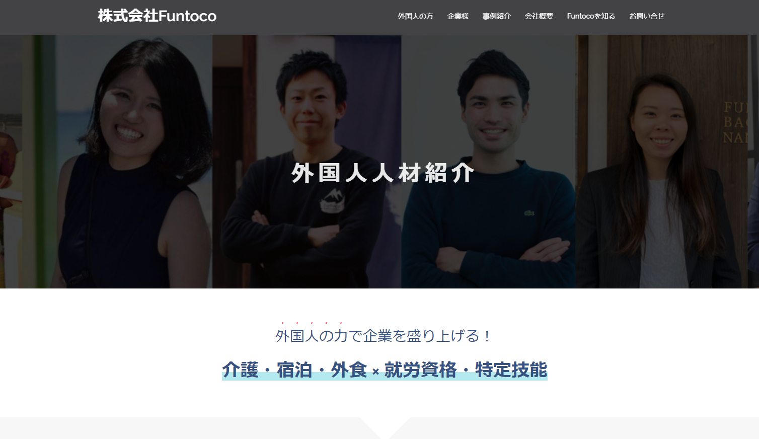 介護、外食、宿泊の3分野に特化して外国人を紹介する「株式会社Funtoco」では、留学生や転職者などの日本在住者、主にミャンマーとインドネシアなどからの海外在住者を紹介しています。取り扱いは、ネパールも含み、ミャンマー、ベトナム、インドネシア、スリランカ、インド、韓国、香港、中華人民共和国、イラン、台湾など。実習生をメインとした就労資格での紹介と特定技能での紹介のどちらも対応可能です。特定技能は登録支援機関として、申請から登録支援業務までサポート可能です。