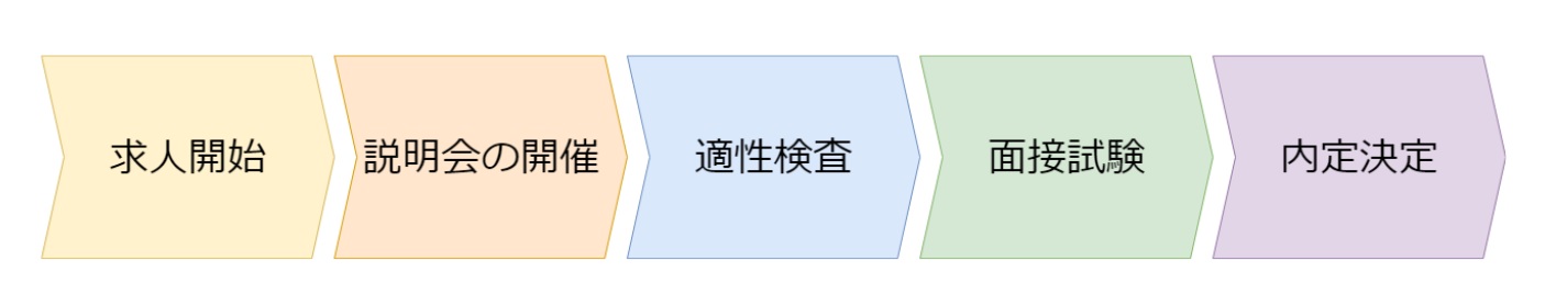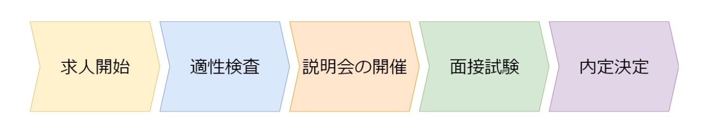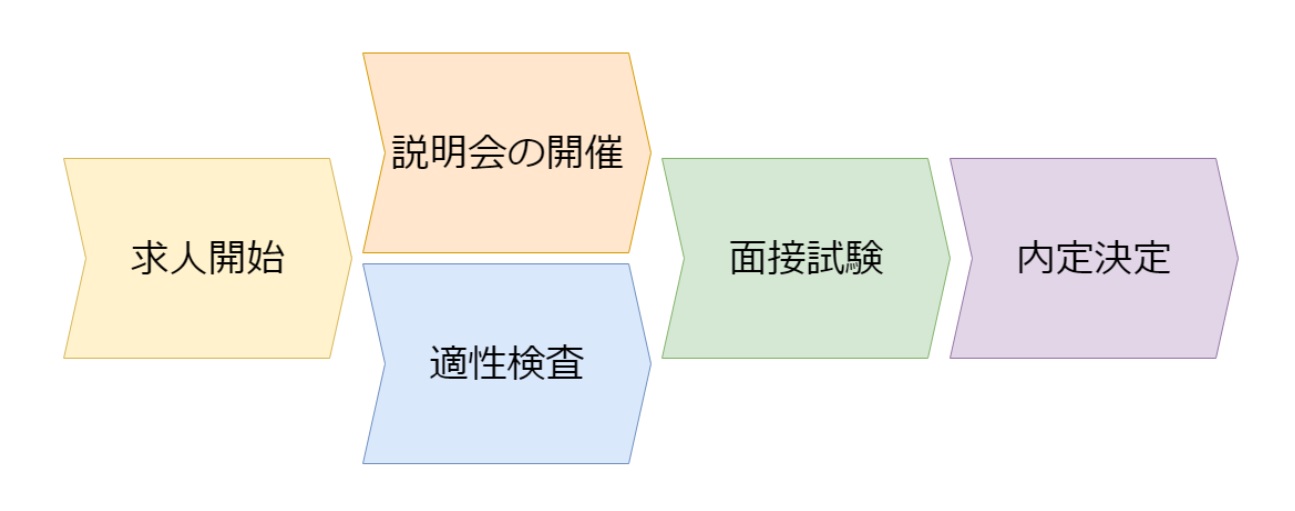 こちらの選考フローは説明会と適性検査を同時に実施する選考一体型の選考フローです。標準選考フローと比較するとステップ数が1つ少ないため、応募から内定までがスピーディに行うことができます。