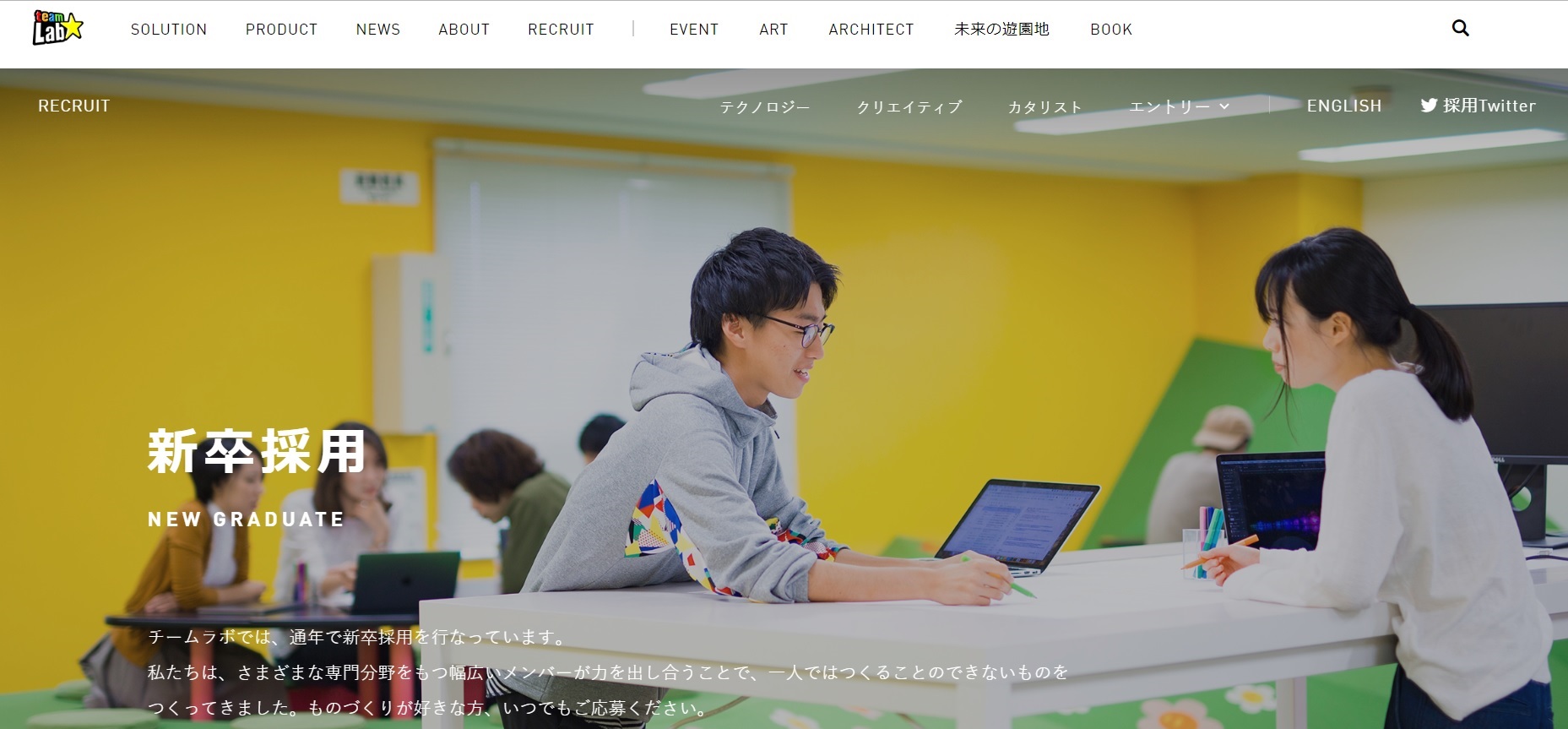 チームラボはエントリーシート、適性検査、面接を一切しない採用を行いました。学生が応募するのに必要なのは、氏名、連絡先、卒論のみです。学生が一生懸命作成した卒論のみで学生の適性を評価するようです。