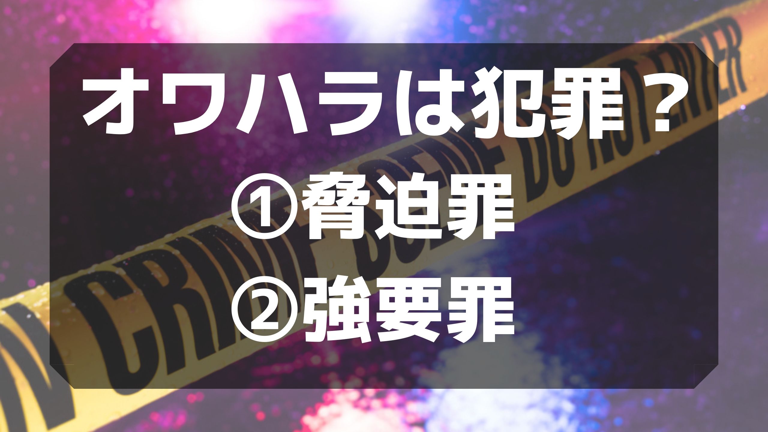 「オワハラ」はハラスメントの一種、というと軽く感じますが、実は重大な罪と解釈することもできます。該当するのは大きく以下の2つです。