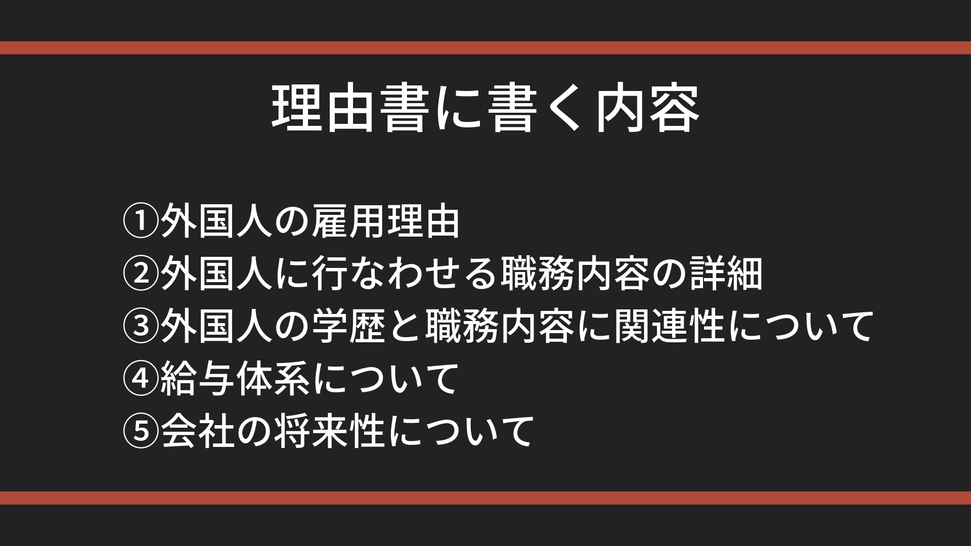 これが全てではありませんが、書くことが多い内容を5つ記載致しました。この中で最も大切な内容は、②です。外国人に実際に行なわせる業務内容はとても大切です。“現場労働ではないか”“パソコン作業だとしても打ち込みだけの単純作業ではないか”など、2019年1月時点では認められていない単純労働ではないことを証明していくことになります。単純労働と誤解されてしまう可能性がある業種の場合は、外国人の作業内容をより具体的に記載することが許可を取れる最も有効的な方法になります。記載するのが面倒という理由で、中途半端に記載をすると最悪の場合不許可になることがありますし、審査中に追加資料を求められる場合がございます。追加資料を求められると、その資料が提出されるまで、もしくは指定の期限が過ぎるまで審査がストップすることになります。また職務内容を記載する場合は、正社員であれば最低でも1日8時間、週5日の作業をするだけの仕事のボリュームも大切になってきますので、その点も意識しながら作成してみてください。他に取り上げた①、③~⑤の内容についても大切にはなりますが、それぞれの状況に応じて書く内容は変化してきます。
