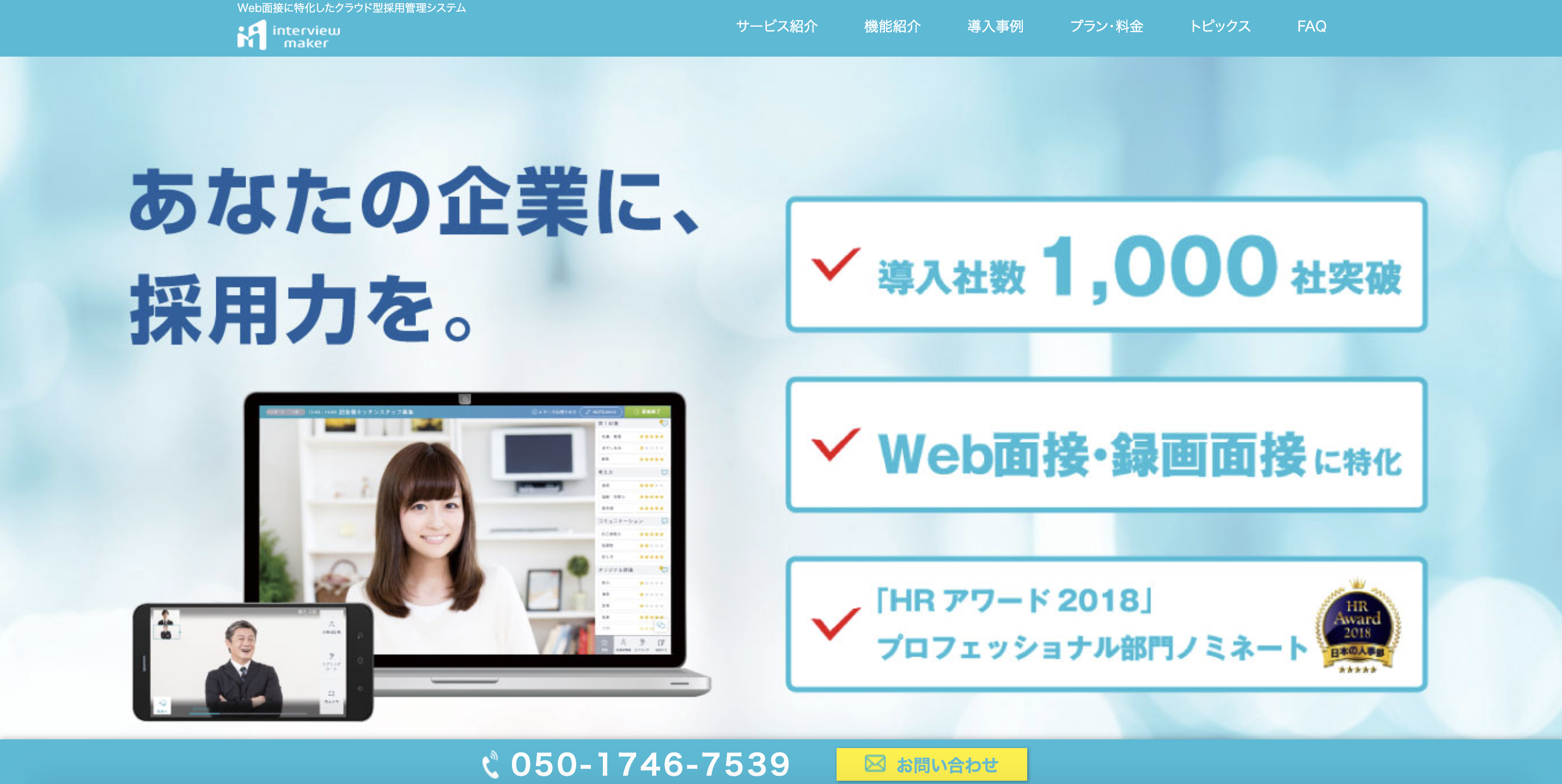 インタビューメーカー(interviewmaker)は、株式会社スタジアム社が展開している録画面接ツールです。導入社数が1,000社以上の実績ある、大規模の録画面接ツールとしても知られています。また、録画面接ツール以外にも、オンライン面接、面接日時のスケジュール調整機能など幅広い利用シーンで活用可能。録画面接ツールとしては、最低月額89,800円~、別途初期費用で利用できます。2020年の新型コロナウイルスの感染拡大に伴い、各サービスを期間限定で無償提供し企業支援を行なっています。