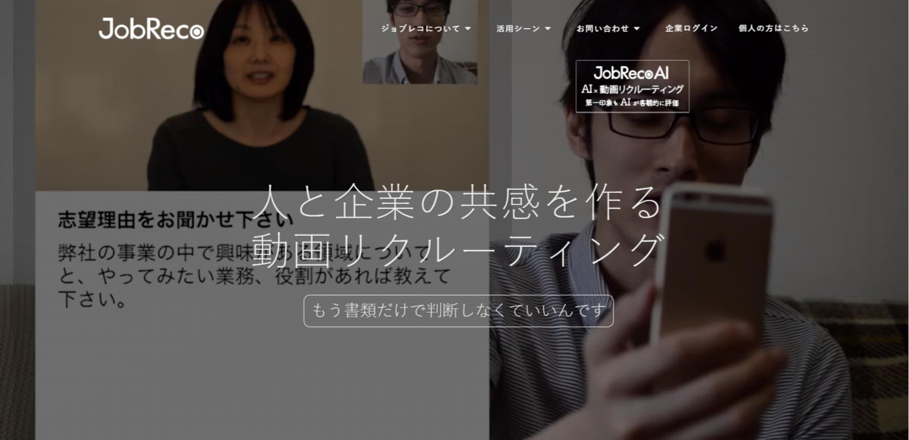 ジョブレコ(JobReco)は、株式会社テイクアンドシーが展開しているスマートフォンでも簡単にできる録画面接ツールです。採用側は、専用のスマホアプリで撮影された動画を確認・シェアすることはもちろん、評価など管理画面上で一括確認できます。また、内定通知や回答時間といった細かなカスタマイズができるのが嬉しいポイント。また、求職者のデータをCSVで一括出力でき、求職者側からの録画動画を個別に対応する手間も省け、少ないリソースでも効率よく選考活動を行えます。