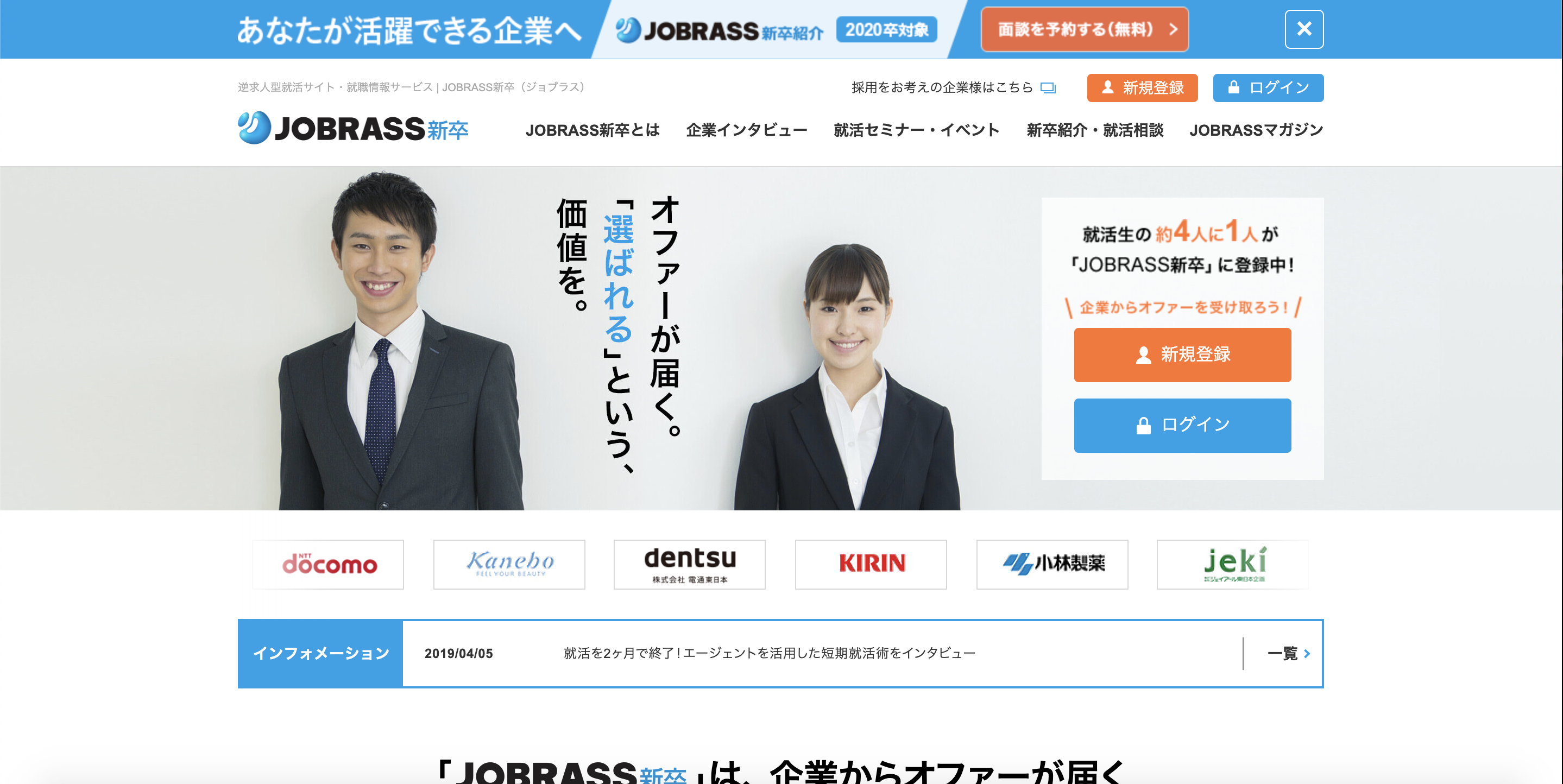ジョブラスとは、求人情報誌や折り込み広告で有名な株式会社アイデムが運営する逆求人サイトです。特徴は、登録をすることで就活生と企業との密なやり取りが可能になるということ。就活生側から、企業のインターンシップや求人募集に応募したり、公開されたプロフィールを見て企業側から就活生にアプローチをかけたりすることもできるのですね。また、合同説明会や内定のコツを学べるセミナーも開催しているため、就活生とのより密なコミュニケーションが可能となります。