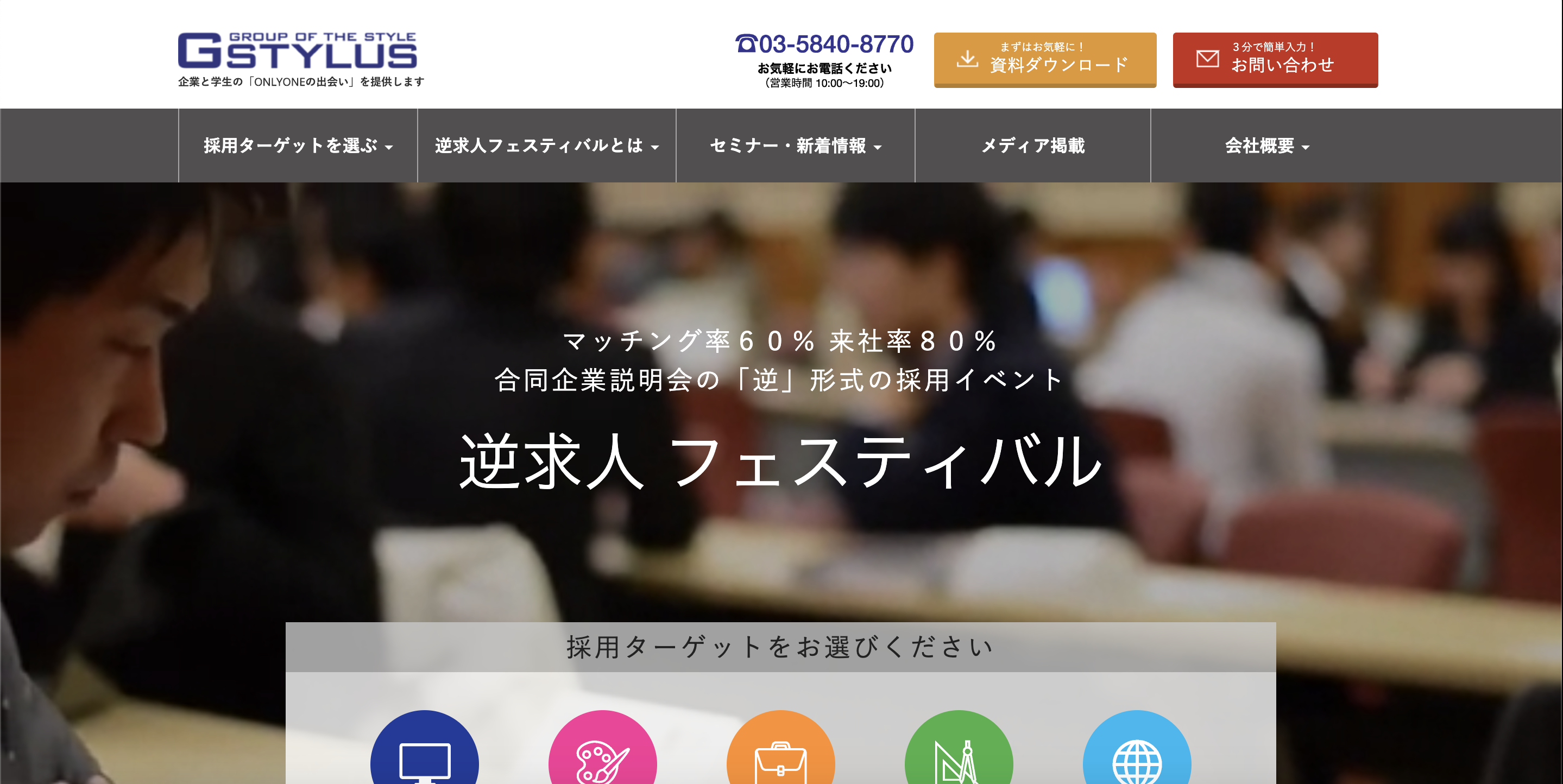 逆求人フェスティバルとは、従来の合同企業説明会の逆の方式で、待機ブースにいる就活生の中から企業担当者が直接指名するものです。特に、株式会社ジースタイラスの行う逆求人フェスティバルは、マッチング率60%と高く評価されていて有名ですよ。就活生は待機ブースで控えており、交渉したい就活生について企業側が面談を申し込む、という形で進められます。1対1で密度の濃い話をすることができるため、ネットで情報収集するだけでは得られない情報を得ることも。