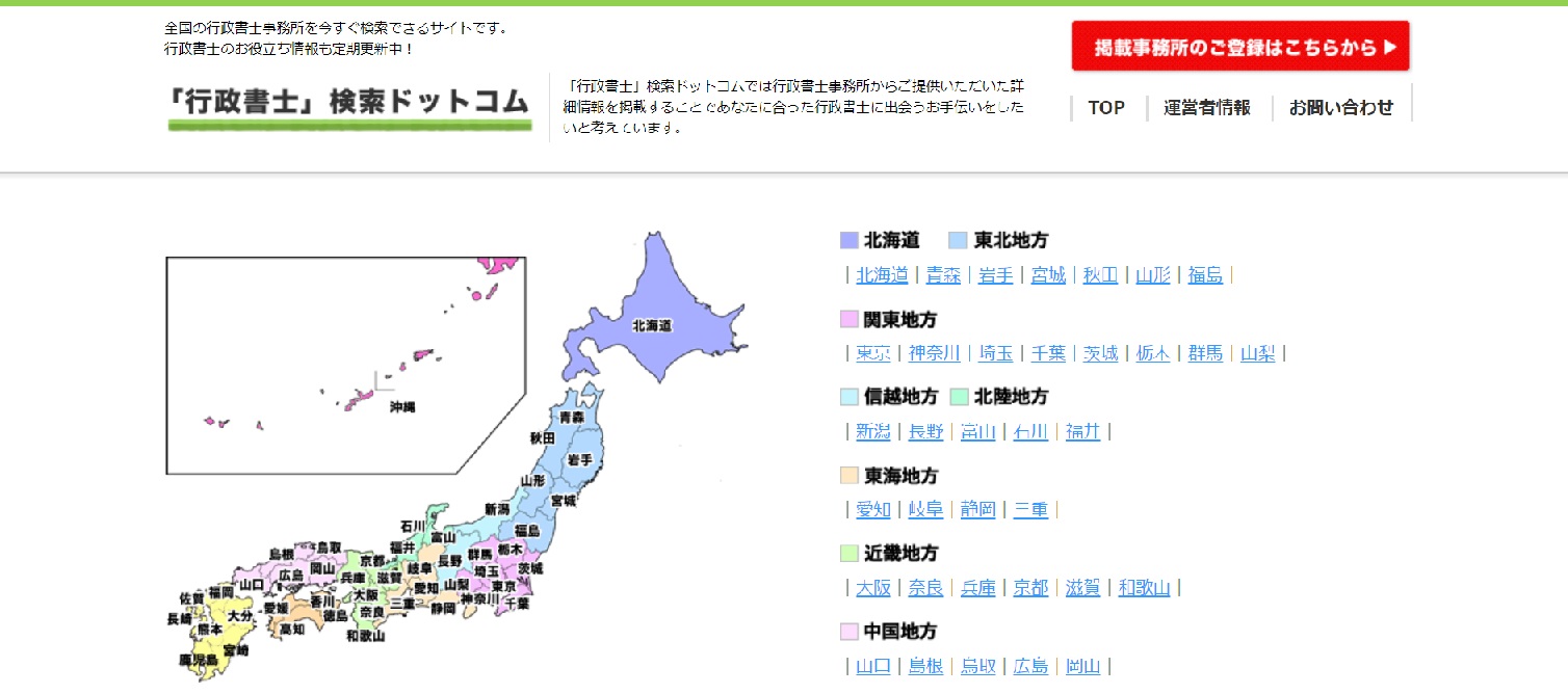 ビザ申請の書類作成や手続代行は、会社設立の手続きや相続受付とは異なり、言語力や入館手続きに通りやすいポイントなどを熟知した行政書士が適任です。このような目的に絞った適任の行政書士を探すには、行政書士事務所を集めたポータルサイト「行政書士検索ドットコム」がおすすめです。地図から地域名をクリックして探すことができるので、近くにある行政書士事務所が一発でわかり、探す余計な手間を省くことができるでしょう。