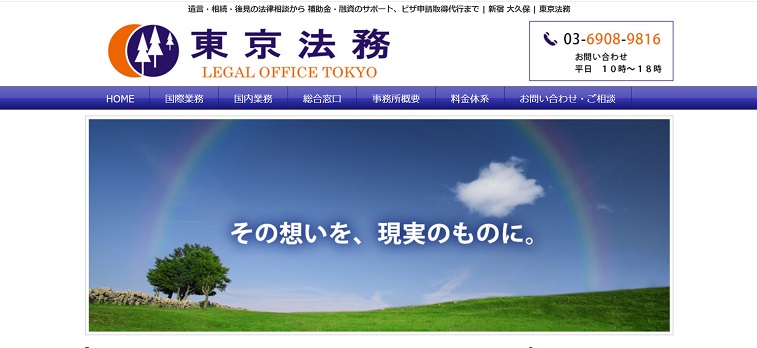 東京法務(東京法務行政書士事務所)は、ビザ申請や永住権許可申請など外国人の就労や移住権などを取り扱っている行政書士事務所です。企業、個人ともに多くの実績があり、ビザ更新手続きは5万円〜、ビザ変更手続きは15万円〜と内容に合わせたプランを用意。日本に在留している外国人が一時帰国など日本から出国し、再入国する際に必要な再入国許可申請など、忘れがちな申請書も幅広くカバーしているので安心して依頼ができます。