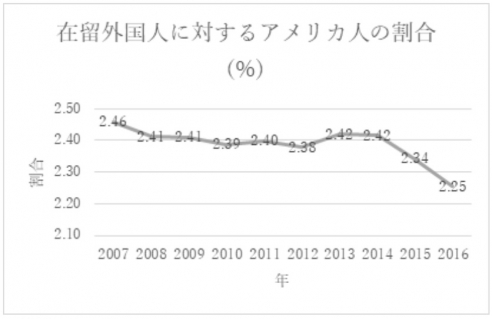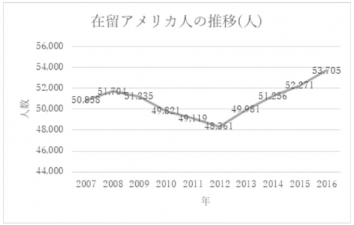 上記より、在留アメリカ人数は、1度落ち込んでいますが、近年増加傾向にあることがわかります。