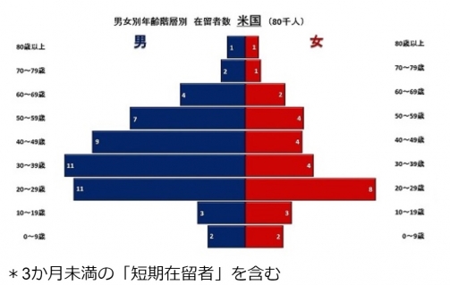 在留アメリカ人女性は男性の半分程度です。年齢階層別構成は、在留者数は多くないにもかかわらず、女性が著しく少ない「クリスマスツリー型」に幅広く分散しています。また、在留資格の「教育」5千人・「公用」2千人・「宗教」2千人・「外交」1千人は国別1位で、短期滞在目的の「家族訪問」8千人は国別2位など、在留目的や理由が最も広く分散しています。