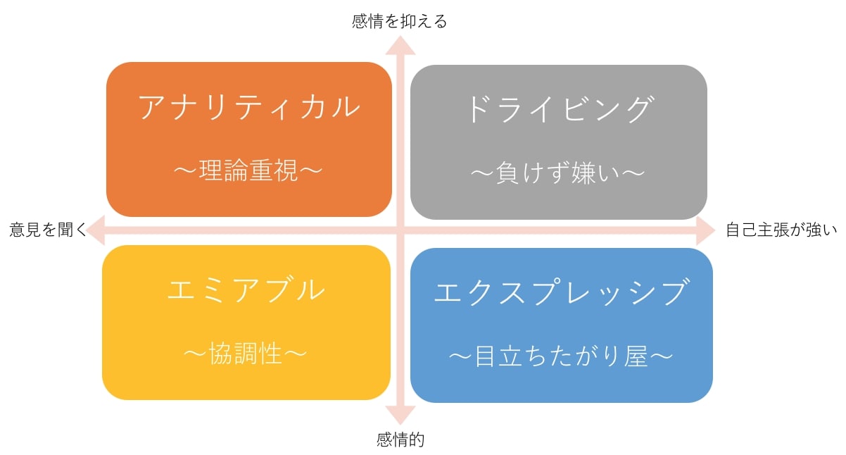 ソーシャルスタイル理論とは、「感情表現の強さ」と「自己主張の強さ」の2軸の観点から、人の性格特性を4種類に分類したものです。1968年にアメリカの社会学者デビッド・メリルが提唱しました。具体的には、感情表現が強く自己主張が弱い「エミアブル」、感情表現が弱く自己主張が弱い「アナリティカル」。さらには、感情表現と自己主張が強い「エクスプレッシブタイプ」、感情表現が弱く、自己主張が強い「ドライビング」に分かれます。