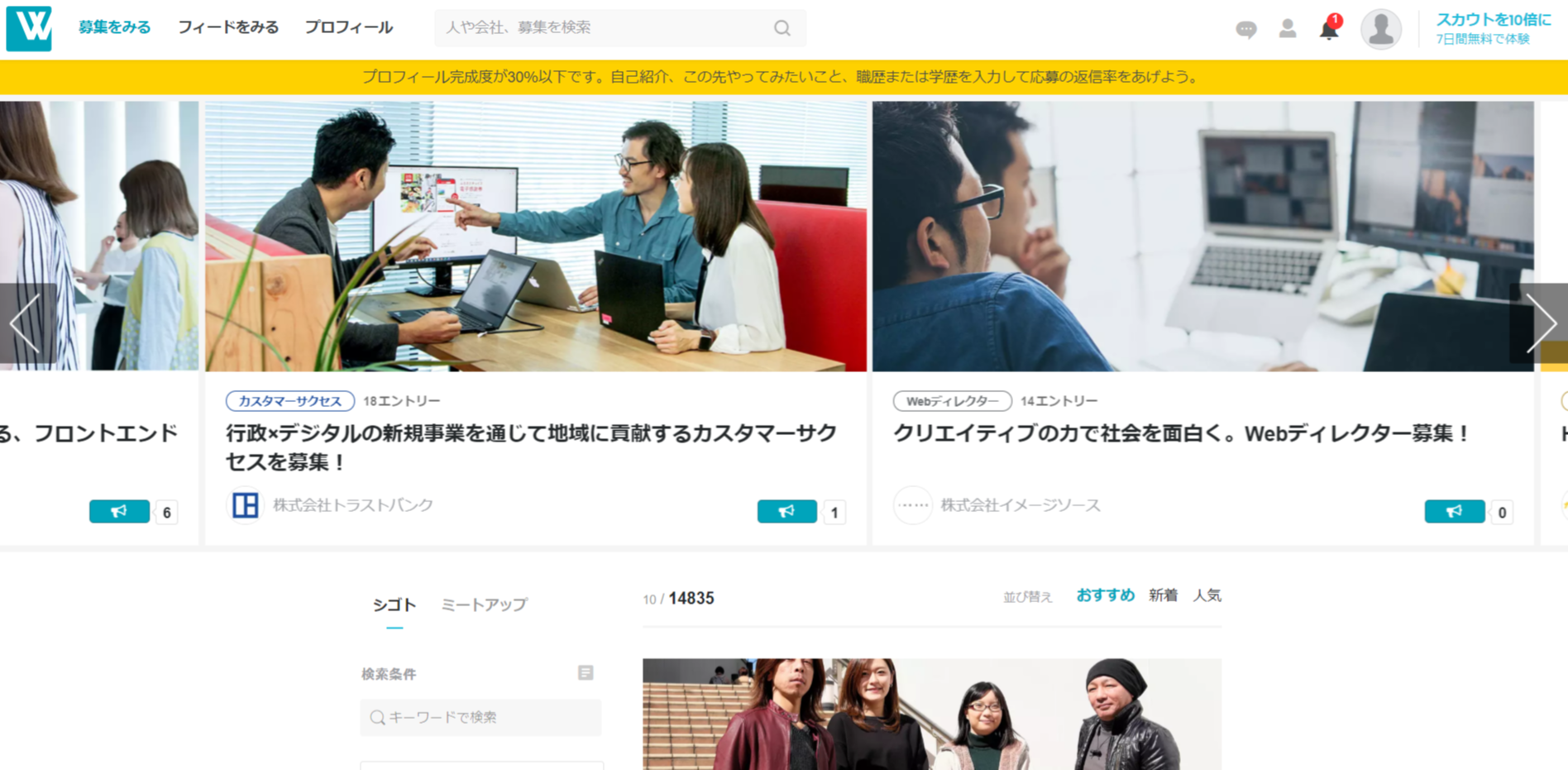 Wantedllyは、さまざまな企業が企業情報を掲載できる転職情報サイトです。Wantedllyでは、特にカジュアル面談を売りにしている企業が多いため、カジュアル面談を受けたい方にもおすすめのサイトですね。企業にとってもメリットがあり、カジュアル面談の情報を掲載すれば転職を考えている人がWantedlly内でカジュアル面談で検索すると表示されるので、おすすめです。その他にもエンジニアやマーケティング、営業、コンサルタントなど職種でフィルターをかけて検索ができるので仕事を探している側も検索されたい企業にとっても便利ですね。また、Wantedllyではメールアドレスなどの情報を共有しなくてもWantedlly内でやり取りができるので、便利です。カジュアル面談を売りに企業の採用を考えている企業はWantedllyでの掲載は必須とえるでしょう。