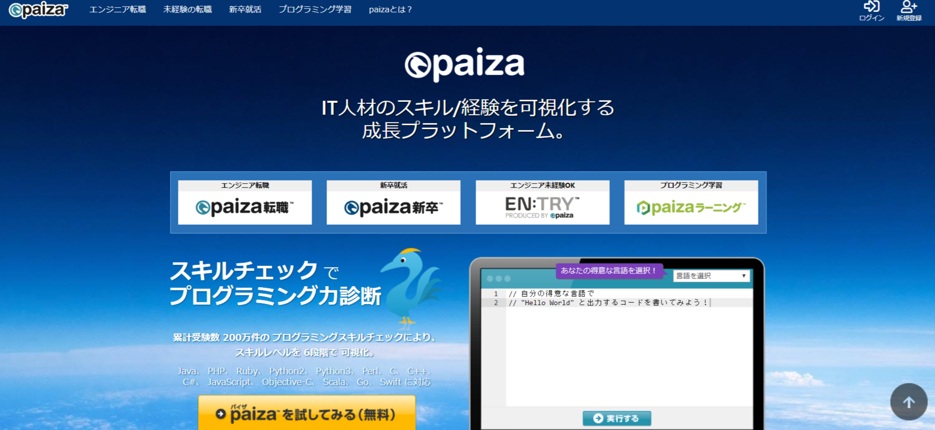 paizaはITとWEBエンジニアの採用に特化しているサービスで、新卒採用から転職エンジニアまでの採用に特化しています。このpaizaもカジュアル面談に特化しており、検索でカジュアル面談と入力すると、カジュアル面談を希望している企業がリストで表示されます。また、転職や新卒で採用されたいと考えている人材もpaizaが展開しているWEBテストを受講し、人材の実力がわかるような仕組みのため、便利ですね。企業と人材のミスマッチを減らし、仕事の難易度もランクごとに別れているので、自分のレベルのあった企業とのカジュアル面談ができます。企業は側も求めているレベルの人材と面談ができ、チームラボやミクシィ、キーエンスソフトウェアなどの上場企業も掲載しています。信頼度も高いと考えられるため、質の高い人材を集めたい企業におすすめといえるでしょう。