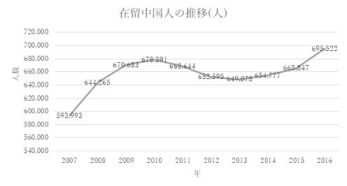 在留中国人数は2013年末以降増加傾向にあることがわかります。2016年末の在留外国人数は前年末に比べ2万9,675 人増加し、69 万 5,522 人となっています。全体における割合は減少している在留中国人ですが、その数は過去最多となっています。