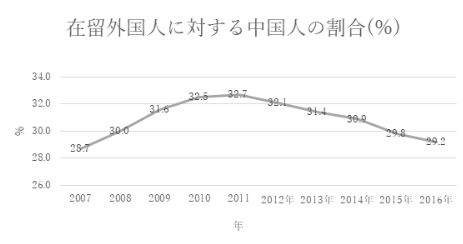 以下のグラフは在留外国人全体における、在留中国人の占める割合を表しています。