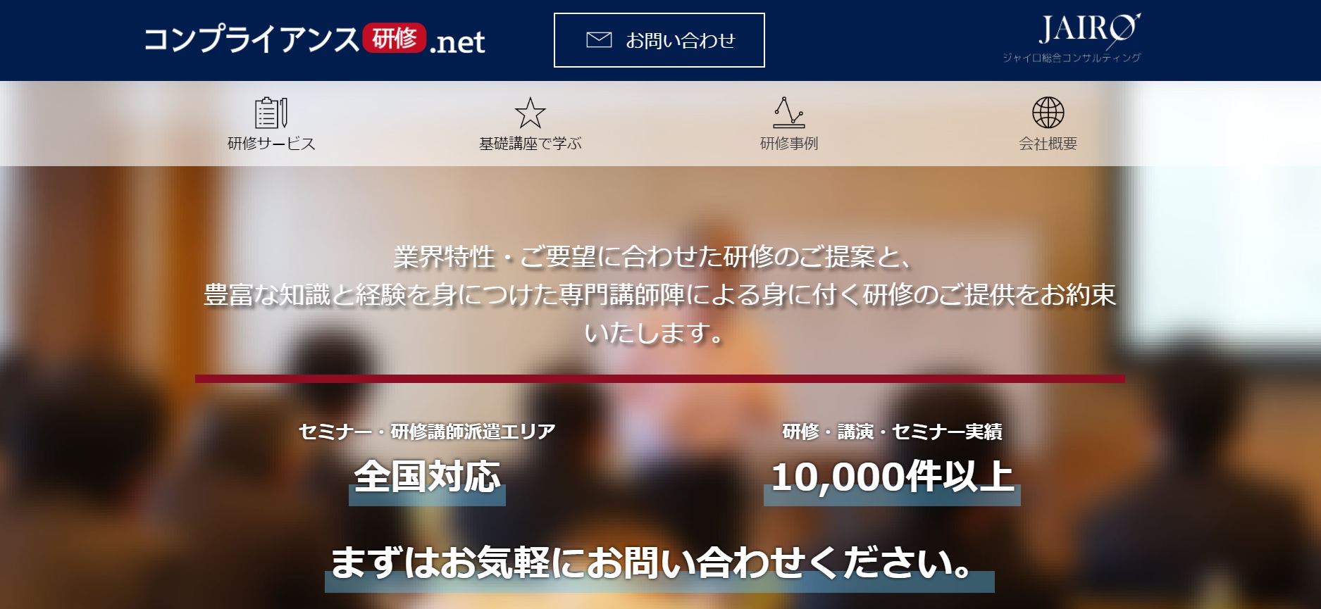 コンプライアンス研修はジャイロ総合コンサルティングが運営しているコンプライアンス専門のサイトです。コンプライアンス研修に関する様々なサービスを提供しています。実際に研修を利用した会社がどのような目的を持っていたのか詳しい実績も掲載されているので非常に役立つと思います。