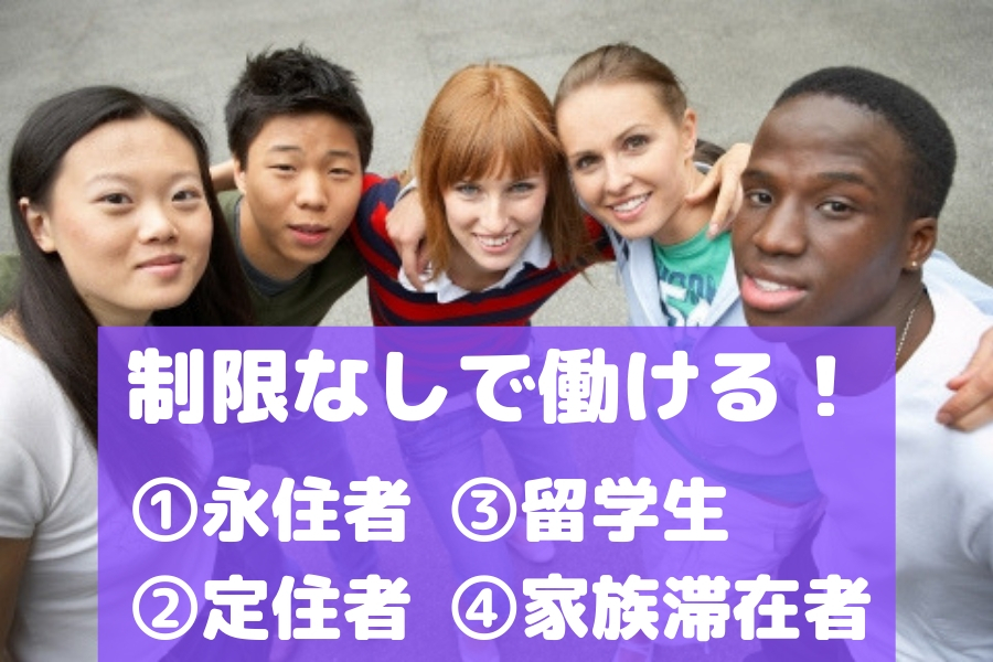 上記の方は、職務内容に関して制限なく働くことが可能で、最近街で良く見かける外国人スタッフは基本的には①~④の方のどれかのビザ)を持っています。