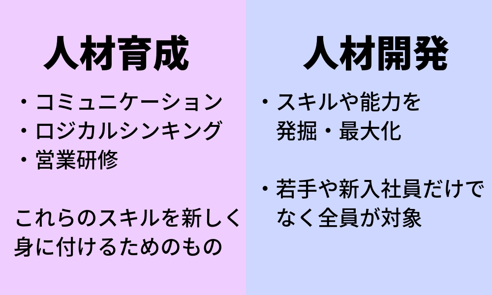人材開発の説明だけをみると、人材育成のことだろうと捉える方も多いと思います。この2つには重なる部分もありますが、人材開発と人材育成は別物です。