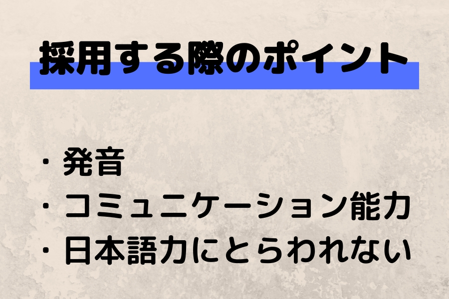 英会話教室と言っても、全員のスタッフが英語を話せるわけではないという場合もあると思います。また、外国人でもある程度日本語を話せる人のほうが安心して採用できるとお考えの方も多いでしょう。しかし、あくまで重要視すべきは、その人の英語の先生としての能力やその場所でうまくやっていける性格等です。日本語能力にこだわりすぎて、優秀な人材を逃すことのないよう、+αの能力として考えておくべきでしょう。