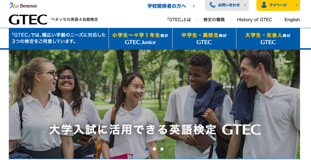 GTECとは Global Test of English Communication の略で、ベネッセコーポレーションにより実施する英語4技能試験です。『使える英語力を測る』というのを標語に掲げており、1997年の開始以降、述べ100万人以上が受検しています。難易度別にCore・Basic・Advanced・CBTの4種類があり、大学入試に利用できるのは主に「CBT」テストです。これも新型英検同様コンピューター試験で比較的受験料が安く、47都道府県で受験ができる点が注目されています。試験時間は休憩なし、約175分で1400満点の試験となっています。ライティングは打ち込み形式なのである程度のタイピング能力も必要かもしれません。