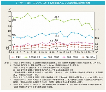 内閣府が調査したフレックス制度導入企業の割合の推移を見てみると、2002年以降、産業計では3.5~6.8%でほぼ横ばいで推移しています。産業別に見たときの導入割合の格差は顕著にみられます。情報通信産業がもっとも多く、学術研究・専門・技術業、電気・ガス・熱供給・水道業などが導入度が高いです。少ないのは、小売りやサービス業界です。社員数が多く、労働時間に融通が利かせられる特徴を持つ企業には有効な施策のようです。導入企業の数は、減少傾向にあるのが現状のようです。