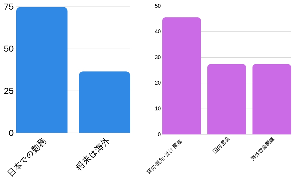 平成26年に行われた留学生が希望する職種アンケートによると、文系留学生が希望する職種第一位は国際業務、理系留学生が希望する職種第一位は研究開発系という結果になりました。
