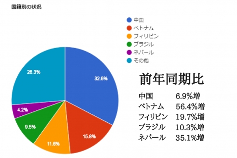 外国人労働者を国別で見ると、最も多いのは34万5千人弱の中国で、外国人労働者全体の約3割を占めています。次いで、ベトナム17万人強、フィリピン13万人弱で、この3カ国だけで全体の6割になっています。対前年での伸び率ではベトナムが56%、ネパールが35%と高いのが目立ちます。