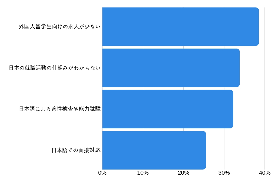 外国人留学生や高度外国人材への就職状況および定着に関する課題に関するアンケート調査では1位に外国人留学生向けの求人が少ない、が38.5%その次に日本の就職活動の仕組みが分からない、として33.8%が回答。また32.2%が日本語による適性試験や能力試験が難しい。同じく日本語での面接対応が難しいが25.5%という割合を占めています。以上の結果でも明らかなように日本語が流暢であるか否かは将来の明暗を分ける非常に重要なキーポイントなのです。
