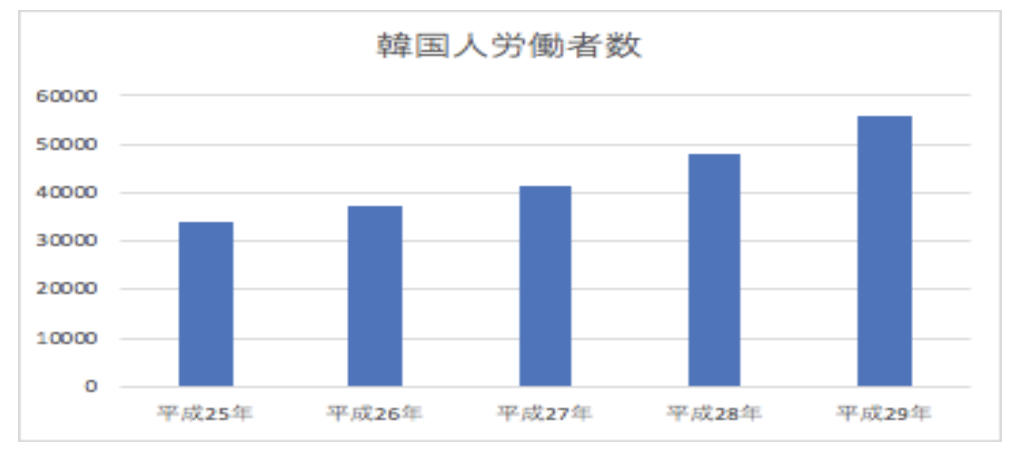 厚生労働省は、平成29年10月末現在の外国人雇用状況を公表しています。上記のグラフは、日本における韓国人労働者の人数です。過去5年間のグラフは右肩上がりに増加していることがわかります。平成28年は48,121人、平成29年は55,926人、対前年増減比は+16.2%です。国籍別に見ても、韓国人労働者数の対前年増減比はベトナム、ネパールに次いで3番目に高い割合です。なぜこんなにも増加しているのか、理由を探ってみましょう。
