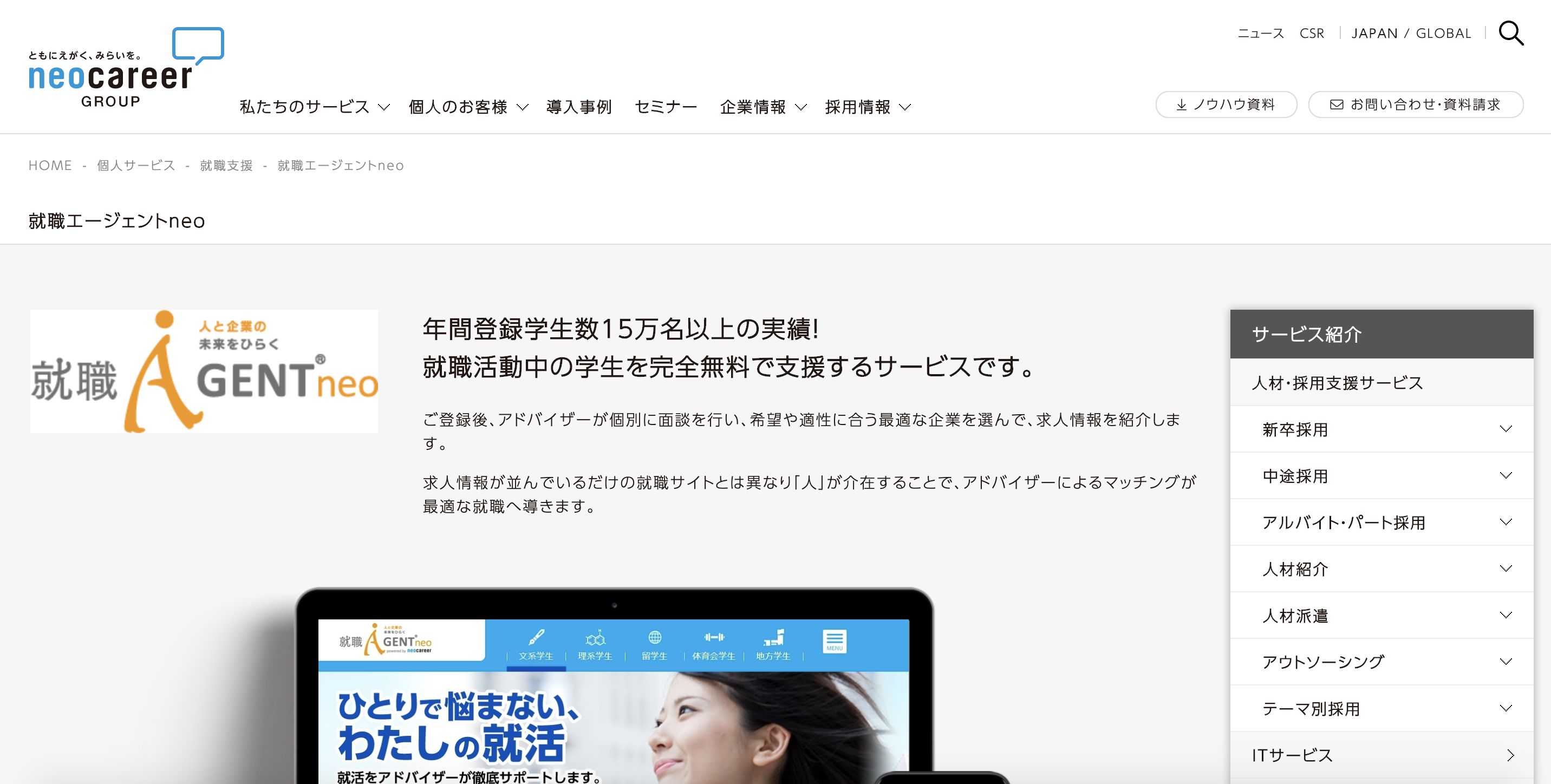 株式会社ネオキャリアが提供する就職エージェントNEOは、新卒紹介サービス業界のパイオニアとして知られています。文系職や理系職であったり、体育会系や上位校学生であったりと、採用したい学生をカテゴリー分けして絞り込むことができます。新卒紹介が拡がり始めた2005年当初から事業を開始しており、延べ10000社を超える企業が導入している点も、大きな強みといえるでしょう。就職エージェントNEOに掲載されている求人は、大手就職サイトに掲載していないものが全体の46%となっています。成果報酬制であるため、就職サイトに広告を出す費用を抑えたいという企業が多く活用しているのです。