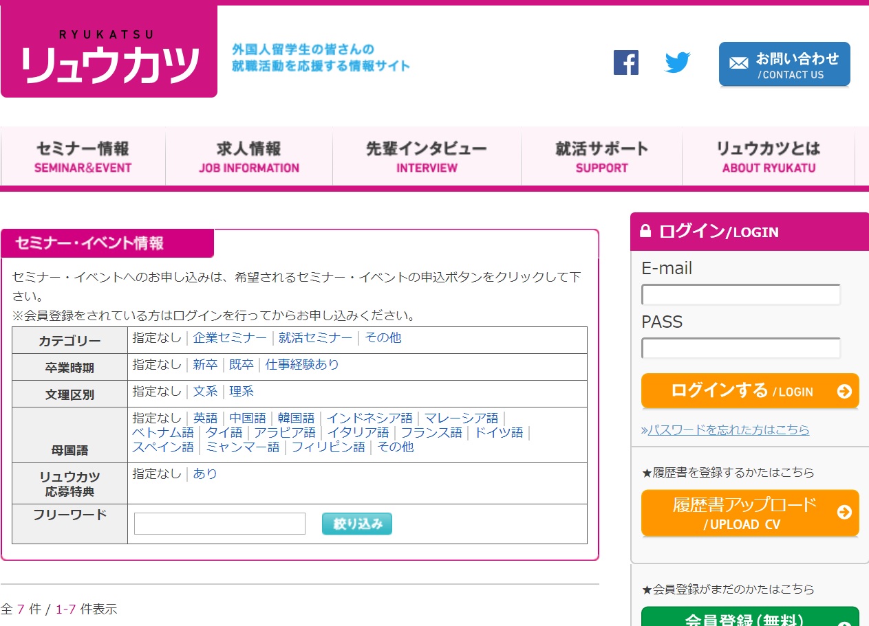日本で働きたい外国人留学生の就職支援をするサイトその名も「リュウカツ」で、セミナー情報に出身国別に分かれた就職活動のセミナーの案内や、インターシップについても情報が紹介されています。