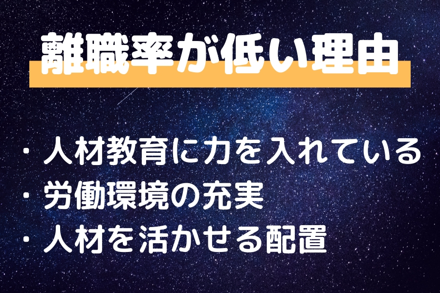離職率が低い企業には、どんな特徴があるのでしょうか。離職率が低い理由として挙げられるTOP3の項目をご紹介します。