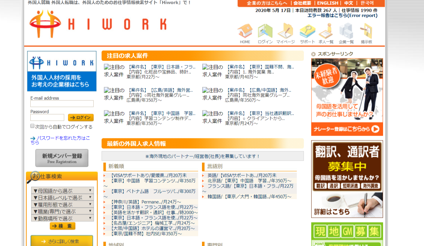 HIWORKは外国人専門の人材紹介・人材派遣事業を展開している株式会社ビーコスが運営する、日本で働きたい外国人の方向けの求人サイト。日本に留学経験がある外国人有志が集まり、1998年に飛魚インターナショナル(ビーコスの前身)として創立。コンテンツは外国人目線でまとめられています。日本での生活に必要な手続きに関する情報や、日本での就職に必要なノウハウが詳しくまとめられています。詳細な条件に基づいて求人を検索できるだけではなく、企業の採用担当者からのスカウト機能も用意されています。韓国、中国(上海)、フィリピン、バングラデッシュに現地法人。